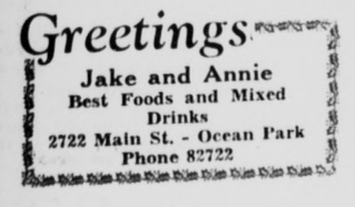 Clyde William Jacobs (1897 – 1942). Born in PA, Jacobs comes to Santa Monica in 1920. In 1934, he opens Jake & Annie’s Cafe with Annie Dierdorf. He dies unexpectedly of heart attack (age 45).