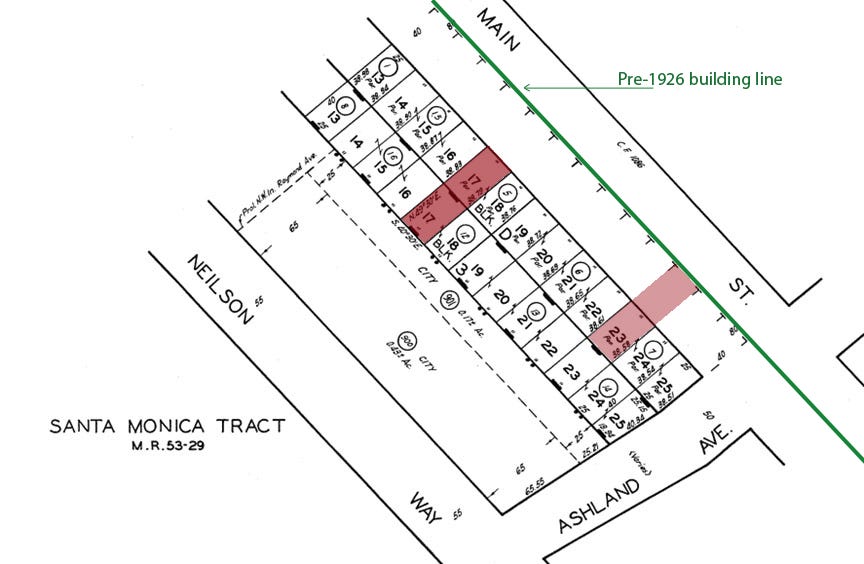 Main St. from Hill to Ashland is closed for 2 days while the move is in progress. Santa Monica contractor J.L. Schimmer constructs the new foundations at 2804 Main St.
