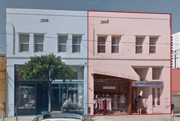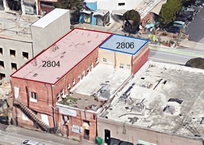 As the building at 2810 - 2818 Main St is in the way, the apartment building (A) is pulled out 40 ft (B) onto Main St. Then the 76 ft long apartment building is moved sideways 150 ft north (C) along the 80 ft wide Main St, and then pushed back 80 ft west (D) to the new (post-1926) Main St building line.